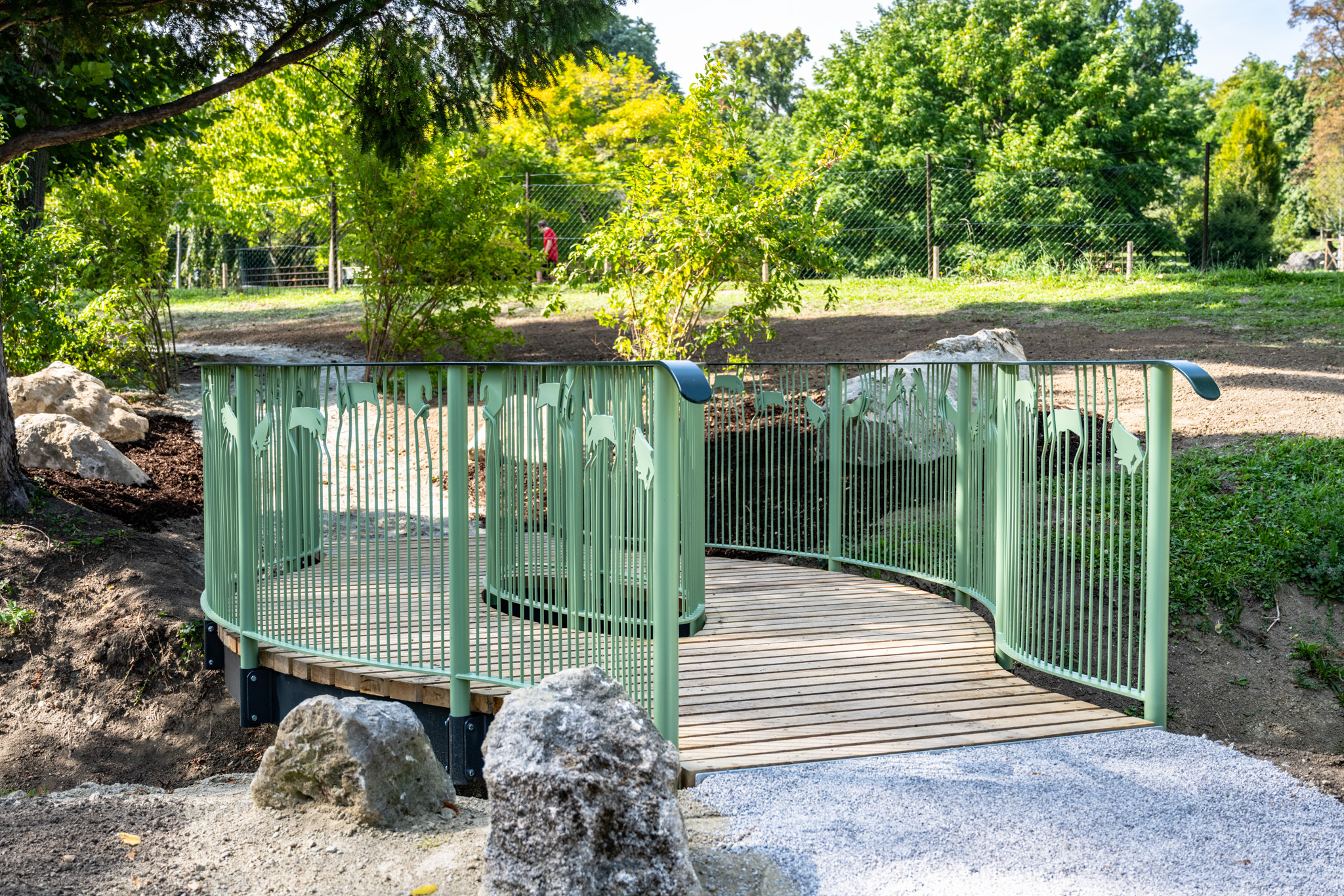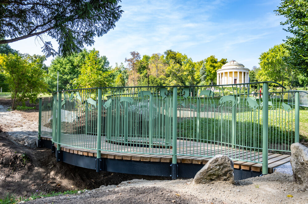 Das zweite HERBSTGOLD-Kunstwerk befindet sich im Schlosspark in der Nähe des Gärtnerhauses. Unterhalb des Hauptwegs am Leopoldinenteich wurde jüngst nach alten Plänen ein schmaler Fußgängerpfad rekonstruiert, der geschlungen vom Gärtnerhaus in Richtung Orangerie führte. Für die Stelle, an der der Pfad über den historischen Bachlauf setzt, hat die britisch-polnische Künstlerin Kasia Fudakowski (*1985 in London, lebt in Berlin) eine wundersame „Brücke mit zwei Wegen“ entworfen: Die Brücke beginnt auf jeder Seite des Bachlaufs als EIN Weg, teilt sich jedoch in der Mitte in ZWEI und gibt in der Mitte einen Blick durch eine oval geformte Öffnung frei. Von oben betrachtet hat sie damit die Form eines Auges. Als benutzbare Sehmaschine wird sie Teil des wiederhergestellten Pfadverlaufs. Von ihr aus wird sich nicht nur ein Panorama reizvoller Blicke in die Ferne hin zum Dom und hin zum Leopoldinentempel öffnen, sondern auch auf die nahegelegene Staustufe des Bachs und – sobald der künstliche Wasserkreislauf tatsächlich wiederhergestellt ist – auf die schimmernde Fläche direkt unterhalb der Brücke. Kunstvoll ist auch das Geländer der Brücke gestaltet: Aus der Ferne erscheinen dort Blätter aus langen Pflanzenstängel zu sprießen. Bei genauerem Hinsehen erkennt man, dass es lauter einzelne Hände sind, die mit ihren Fingern die Stangen zupfen, als seien sie Saiten einer Harfe.